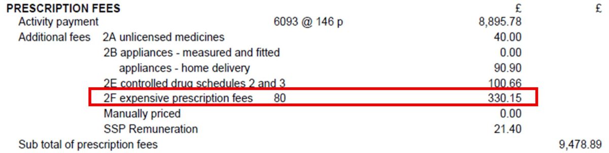 Part IIIA of the Drug Tariff outlines the different professional fees pharmacy owners receive for dispensing prescriptions, including the expensive prescription fee. For every item with a net ingredient cost (NIC) of £100 or more, pharmacy owners receive a fee equal to 2% of the NIC which is calculated based on the total quantity of that individual item dispensed on the prescription form. This applies to both drugs and appliances.