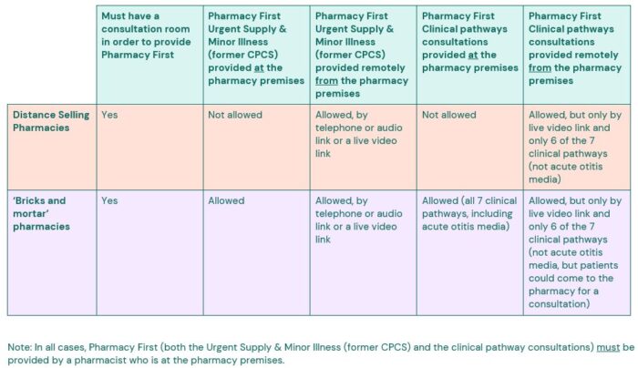 In most circumstances, the service requirements do allow remote consultations to be provided by a pharmacist who is at the pharmacy premises, but there are exceptions and specific requirements to be aware of, which are set out in the table below.